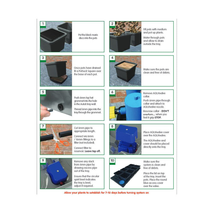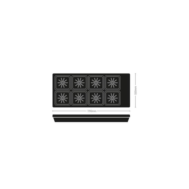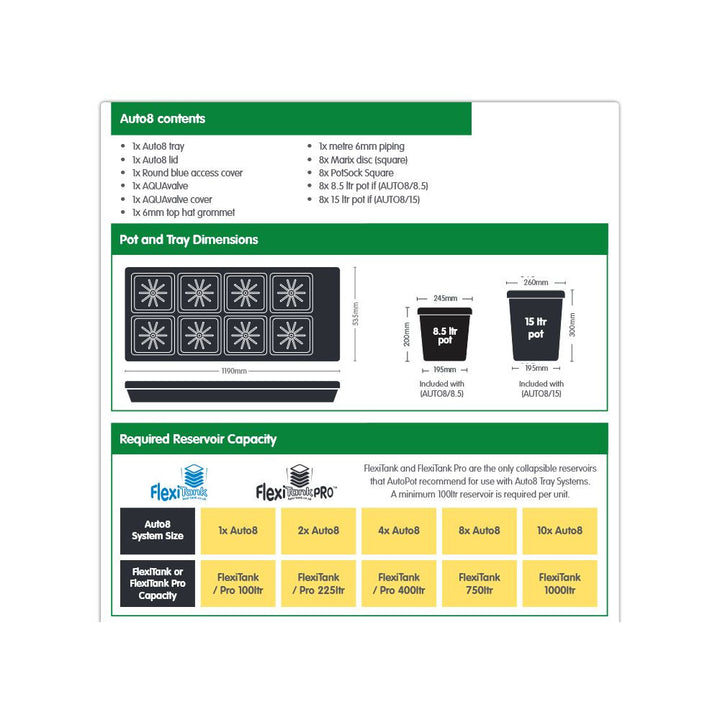 Das AutoPot Auto8-System mit 15-l-Osmi-Belüftung funktioniert nach dem herkömmlichen Standardsystem, das mit dem AutoPot-System und dem AquaValve-Ventil ausgestattet ist. System pro 8 rostlin lze snadno napojit pomocí dokoupitelného příslušenství na nádrž Flexitank. Größe: 1190 x 535 mm.